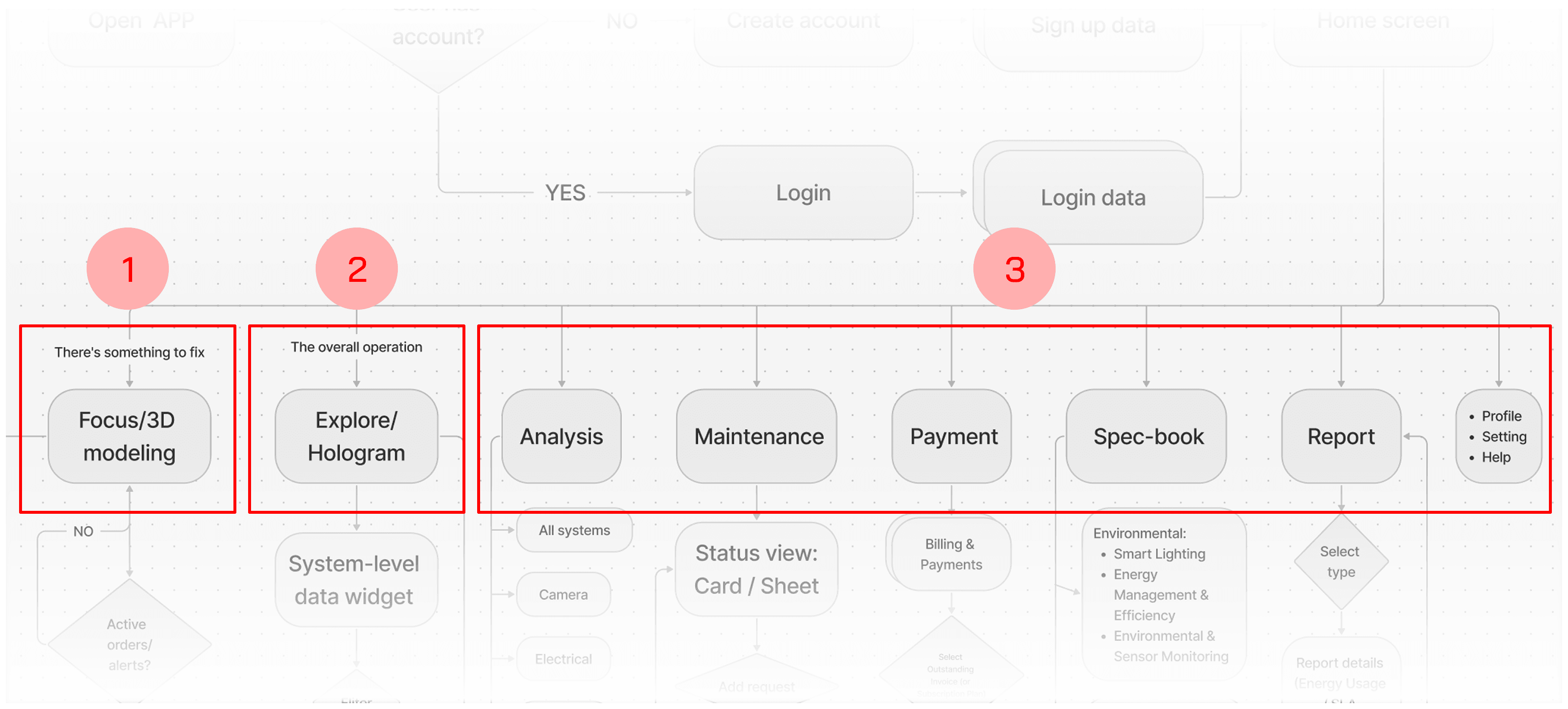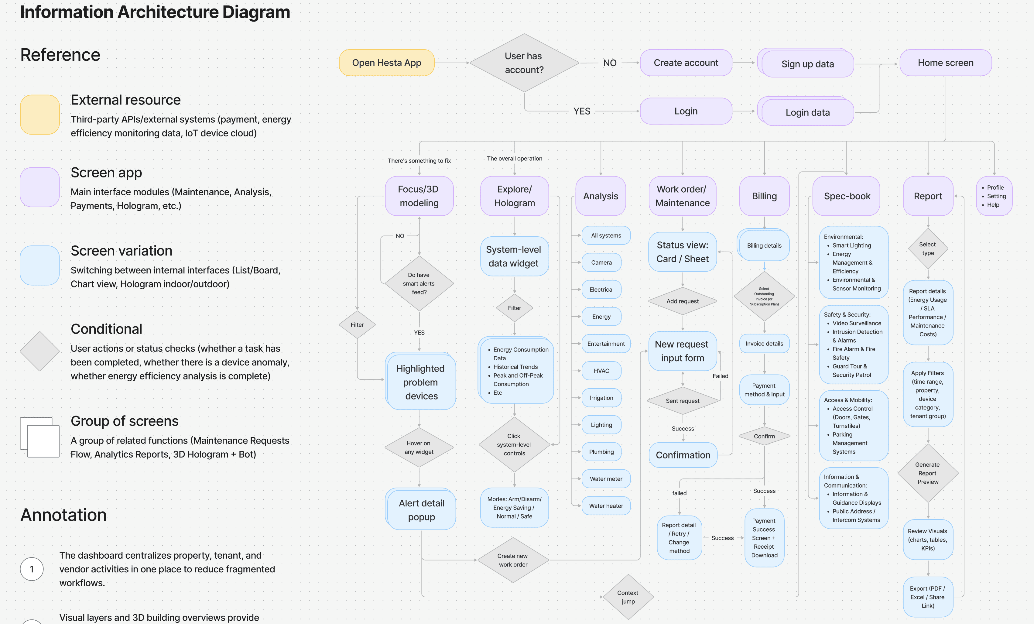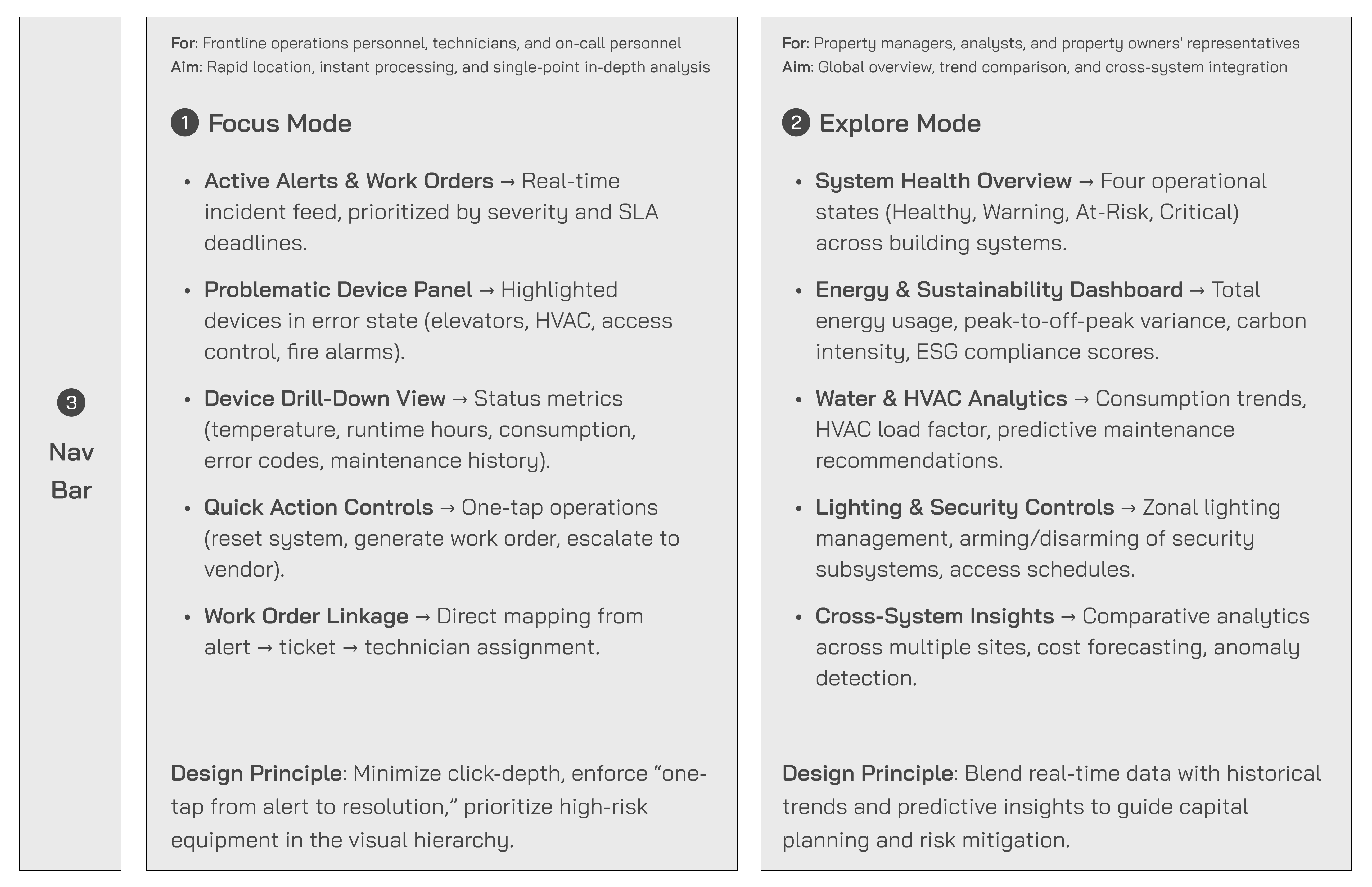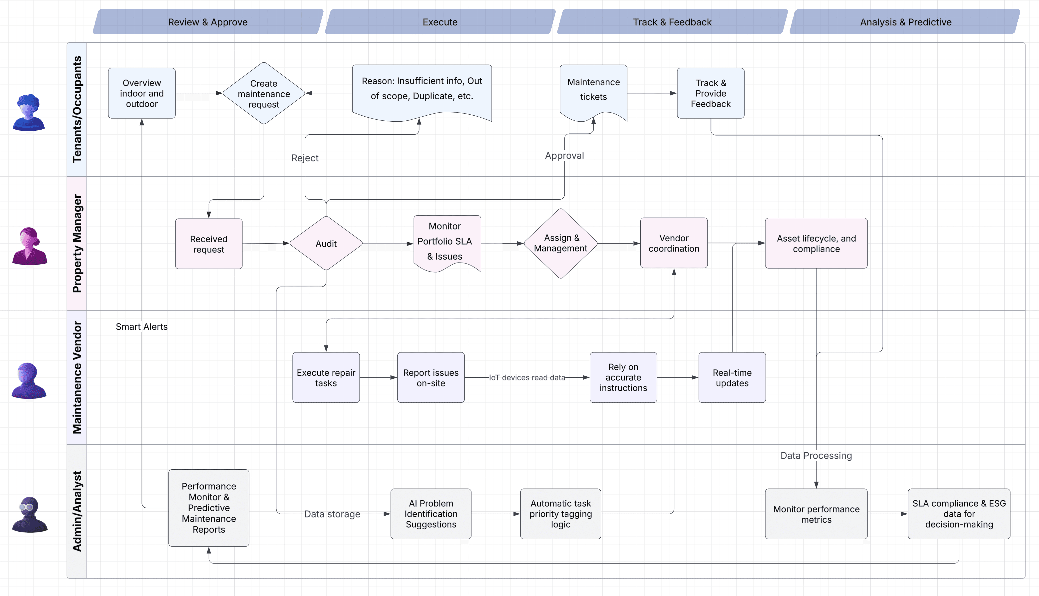 Then, I mapped their specific actions, handoffs, and pain points onto one unified place, which visualizes how maintenance tickets, smart alerts, and SLA tracking flow across roles, ensuring that nothing falls through the cracks.
